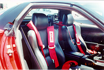 Custom made by Rhys Millen of Rod Millen Motorsports. The mount goes between the eyebolts for the harness. The camera isn't on the mount, it's in the shop for repair from all the dust from those spinouts at the track. Camera used is a Sony TRV40 Video 8 camera. I screwed up and should have gotten the HI-8 camera, since it will make make cleaner copies of tapes. Update June 1998 - got one of them generic camera mounts to go on the rollcage, as I had to remove this for the rollcage. (update June 1998 - using those camera mounts that you get from your local raceshop) |