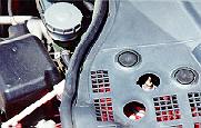 I wear this all the time. After you use the five point harness(I don't use the sub strap), you don't feel safe using the regular seatbelts in everyday traffic. Below is the rear view of the eyebolts from the engine compartment. Andy Warren has said that I should increase the size of the metal backing, as it doesn't fit SCCA standards for safety. Update June 1998 - five point harness now wraps around the new rollcage. |