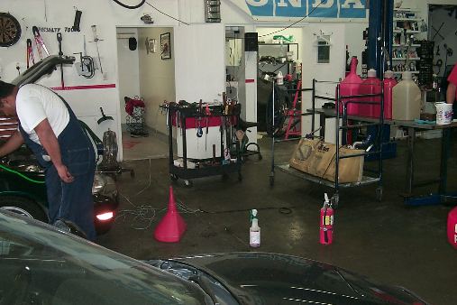 There is a running car at the front of his shop with the hood up. He takes out a bunch of stuff so he can get to the voltage regular of the running car, and hooks my fuel gauge up to the voltage regular, to simulate what it will be like when I am driving in the car and I look at the fuel gauge.