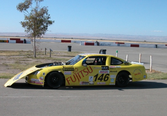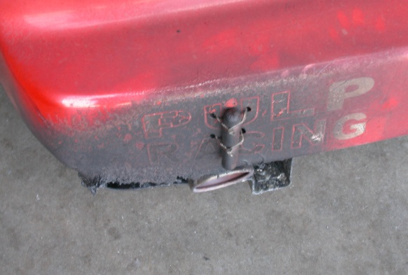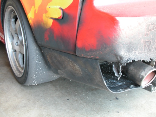 We radio again to coming, as it looks like the bumper is on fire again, and we don't want the entire car to burn up, but again all he hears is the word "FIRE". Finally, he hears us, pulls in, and we check the car in the hot pit, and the fire is out, but we decide to park it in the garage and check it out. We don't see anything leaking, but now we are suspecting that the fuel cell venting hose is venting gas unto the exhaust, which burst into flames, which then lit up the bumper, and is now cooking the hotdog that is tie wrapped to the fender to well done.